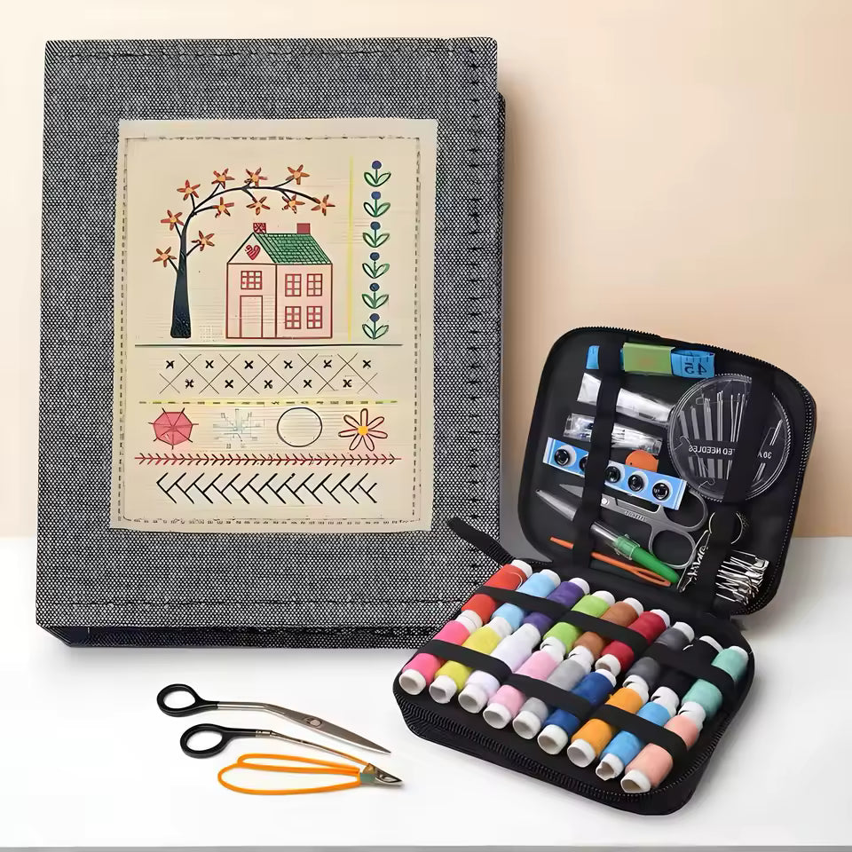I varje kit hittar du: 1x broderibok med tygsidor, 1x nål, 1x trådare, 1x broderisax och ett komplett set med färgglada trådar.